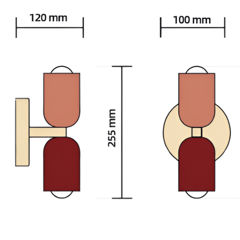 Denna färgglada nordiska vägglampa kombinerar lekfull design med elegant retrokänsla. Med sina två kupoler i kontrasterande nyanser – terrakotta och persika – ger den ett varmt, konstnärligt uttryck till väggen. Den rundade metallbasen i mjuk beige ton förstärker lampans mjuka estetik. Ljuset sprids både uppåt och nedåt vilket skapar en dekorativ effekt. Perfekt för hall, vardagsrum eller sovrum där du vill addera både färg och personlighet.