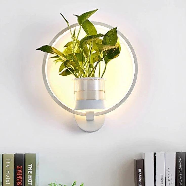 Denna moderna LED-vägglampa är både en ljuskälla och en dekorativ detalj som ger ditt vardagsrum ett stilfullt lyft. Den runda designen med integrerad LED-belysning skapar ett mjukt och jämnt ljus som ramar in den centralt placerade växthållaren. Kombinera funktionell belysning med grönska för att skapa en levande och harmonisk känsla i rummet. Den minimalistiska designen i vitt passar perfekt i moderna hem och blir en vacker kontrast mot både ljusa och mörka väggar. Perfekt som stämningsbelysning i vardagsrummet eller hallen.