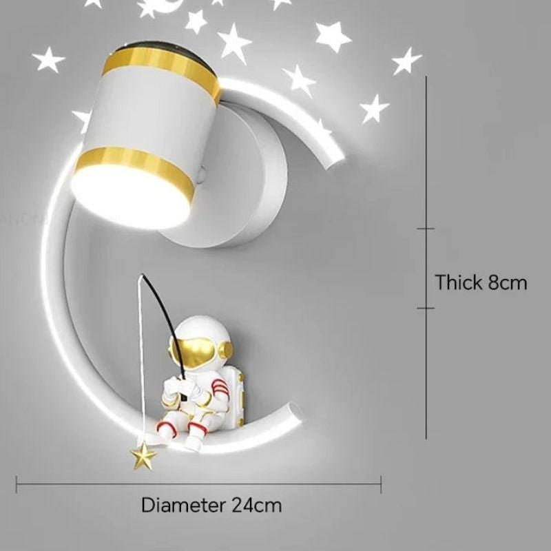 Skapa en magisk och stämningsfull känsla i barnrummet med denna kreativa vägglampa med LED-belysning. Lampan kombinerar en lekfull astronautfigur som sitter på en månskära med en mjukt lysande stjärnhimmel som sprider ett lugnande sken i rummet. Den energieffektiva LED-belysningen håller sig sval och ger ett behagligt ljus, perfekt som nattlampa eller mysbelysning. Modern design och fantasifulla detaljer gör att lampan blir ett älskat inslag i barnets rum. Enkel att montera och säker för barn – en perfekt blandning av funktion och fantasi.