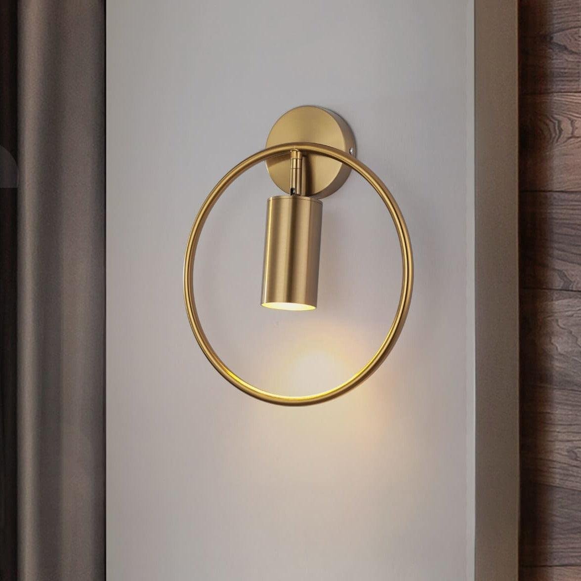 Denna vägglampa i mässing kombinerar det bästa av två världar: klassisk elegans och modern minimalism. Den cirkulära ramen skapar en mjuk form som kontrasteras av den raka ljuscylindern i mitten. Perfekt för att skapa en mysig atmosfär i hallen, vardagsrummet eller sovrummet. Mässingsfinishen tillför en lyxig känsla samtidigt som den fungerar som en diskret inredningsdetalj som kompletterar både moderna och klassiska hem.