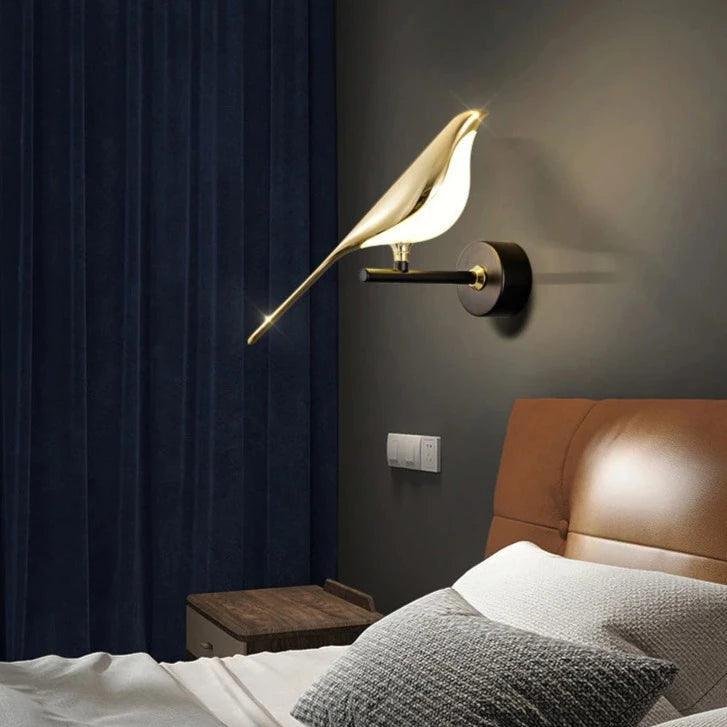 Skapa en elegant och drömlik känsla i sovrummet med denna unika vägglampa i mässing. Lampan har en stilfull design där en fågelliknande figur i polerad mässing fungerar som både belysning och dekorativ detalj. Det mjuka ljuset strålar ut från undersidan av fågelns kropp och skapar en varm och stämningsfull atmosfär i rummet. Den svarta väggfästet skapar en snygg kontrast mot mässingen och gör lampan lätt att kombinera med både moderna och klassiska sovrumsmiljöer. Perfekt som sänglampa eller accentbelysning som ger rummet karaktär.